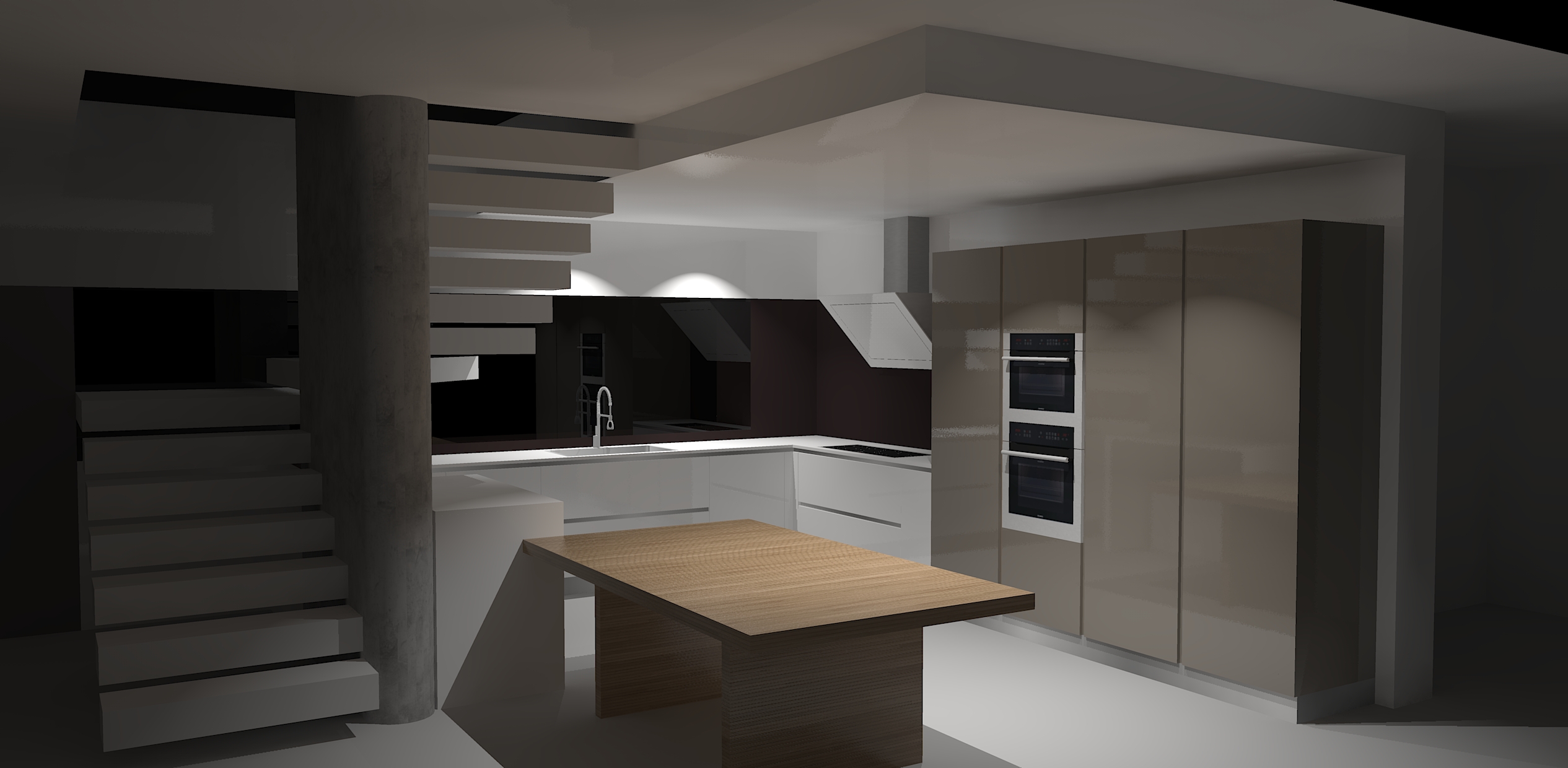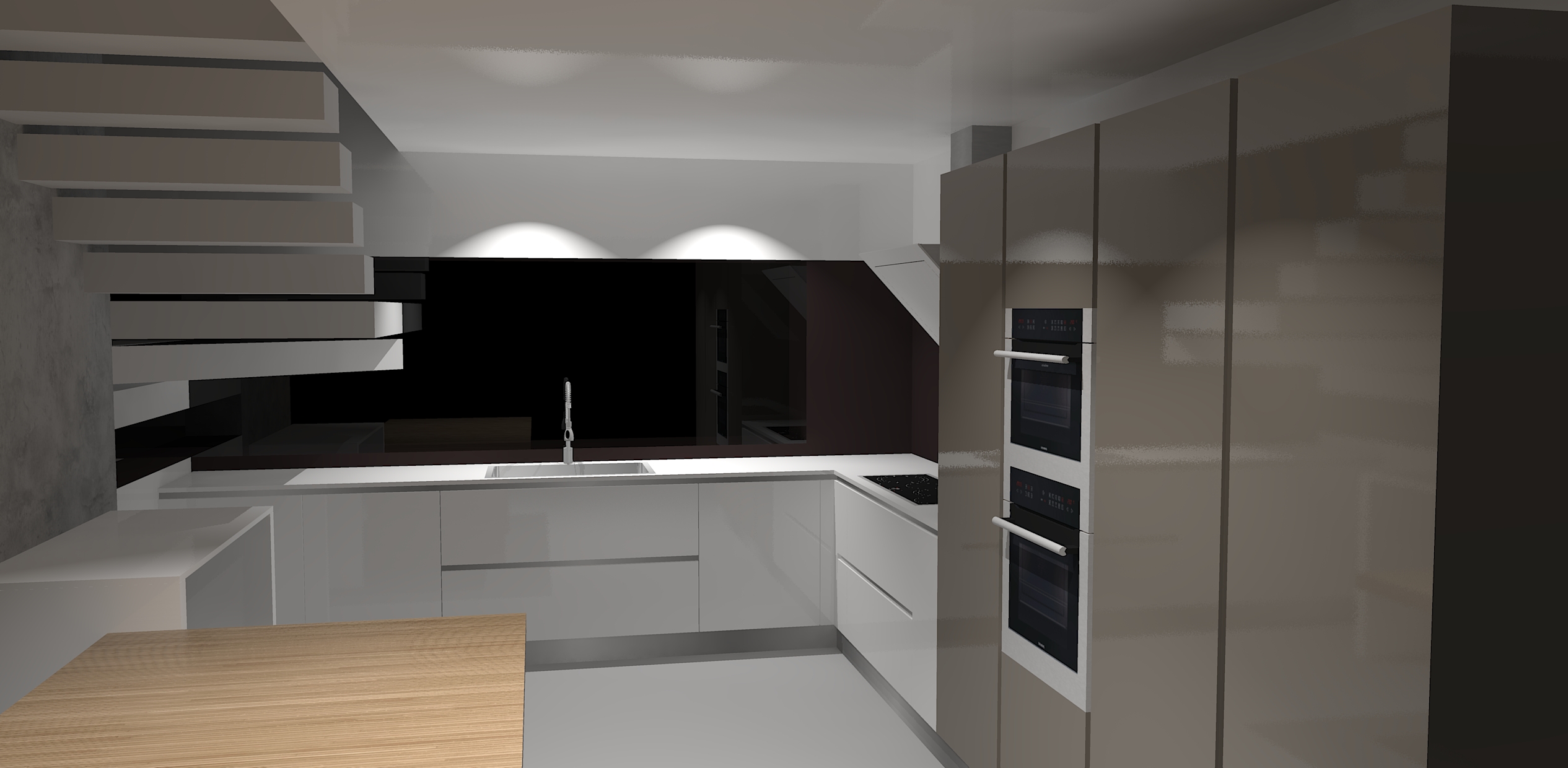 Grande sfida dovendo garantire 8 posti a tavola e spazi per il cucinare e conservare adeguati alla famiglia. L’ambiente esistente, pur sembrando ampio per la mancanza di pareti divisorie, presenta dei vincoli importanti dovuti a zone di passaggio e alla presenza della scala aperta sul vano.