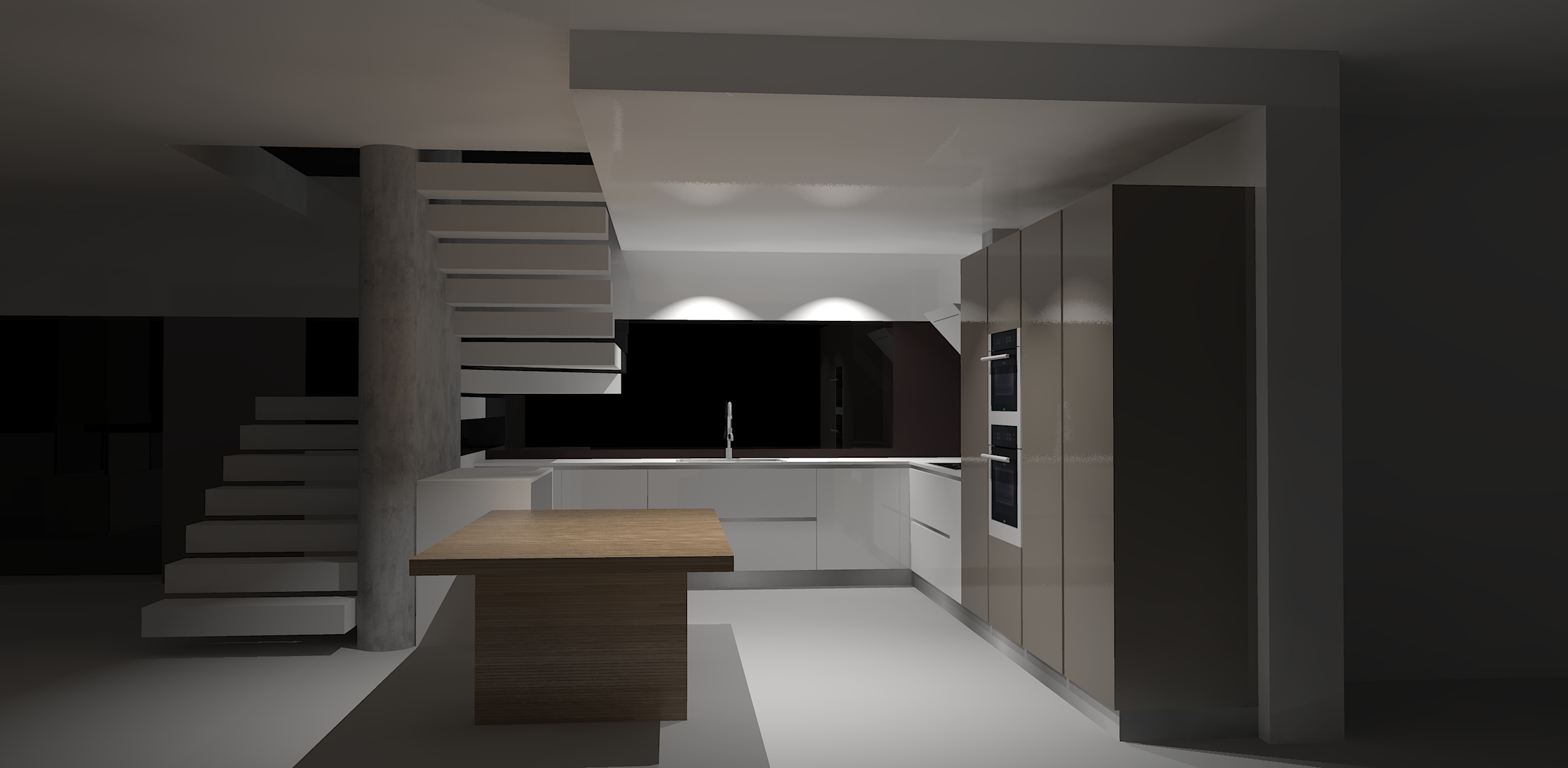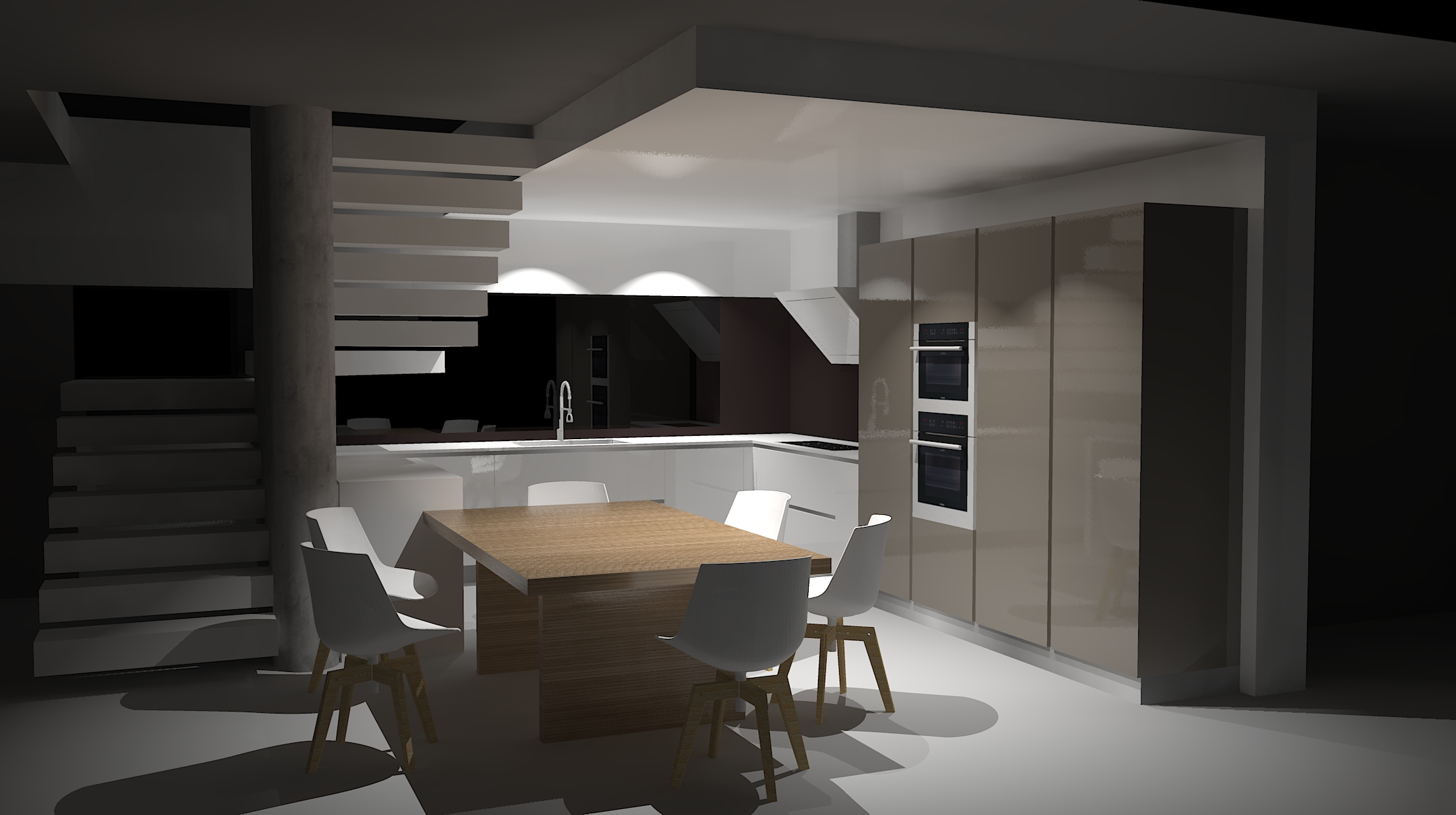 Risultato più che ottimo, con la solita attenzione all’illuminazione artificiale studiata al fine di illuminare le zone di lavoro assicurando ambiti di relax sopra il tavolo e nel vicino soggiorno.